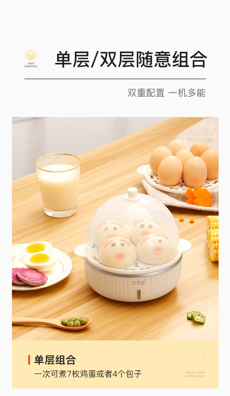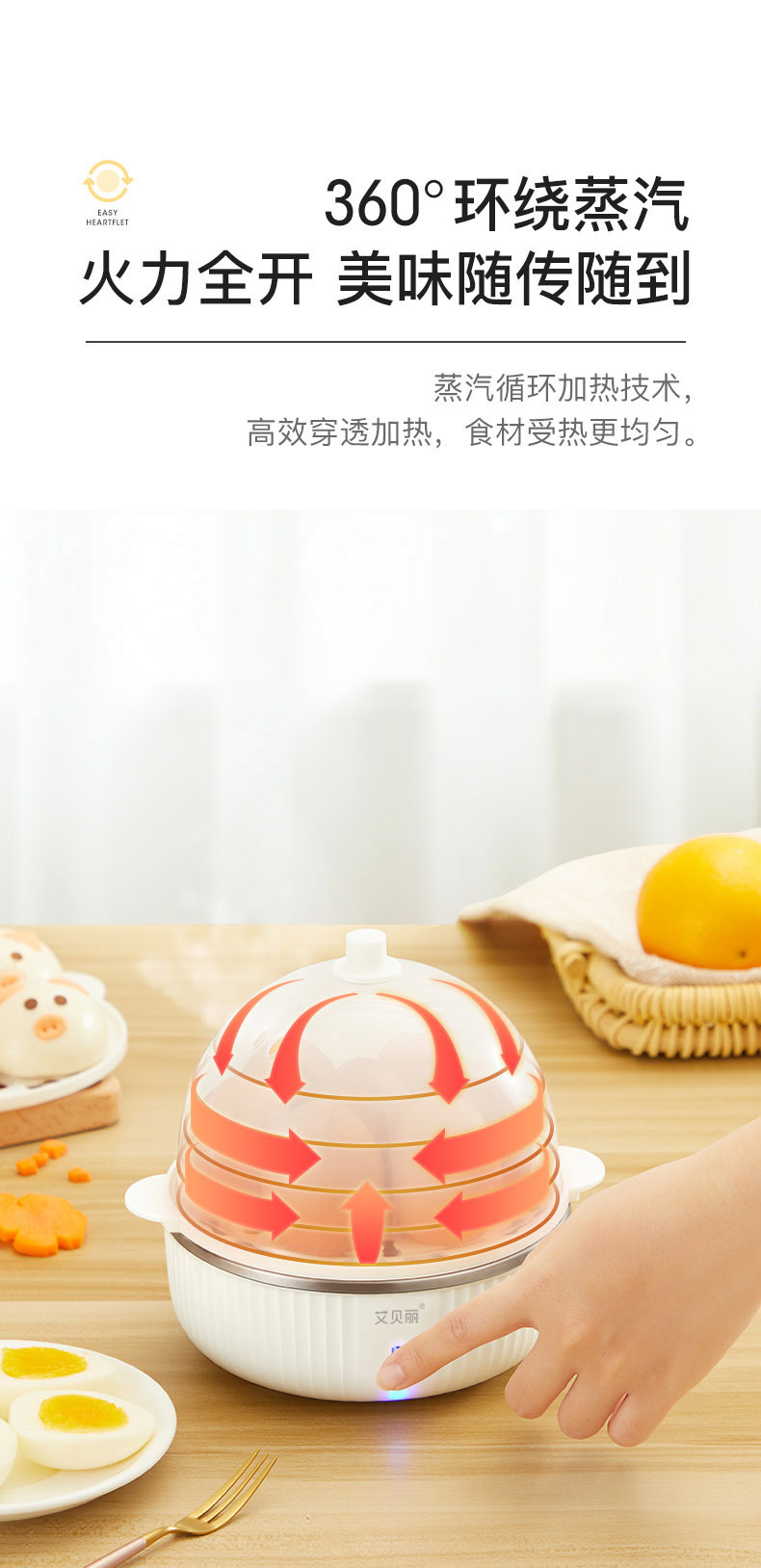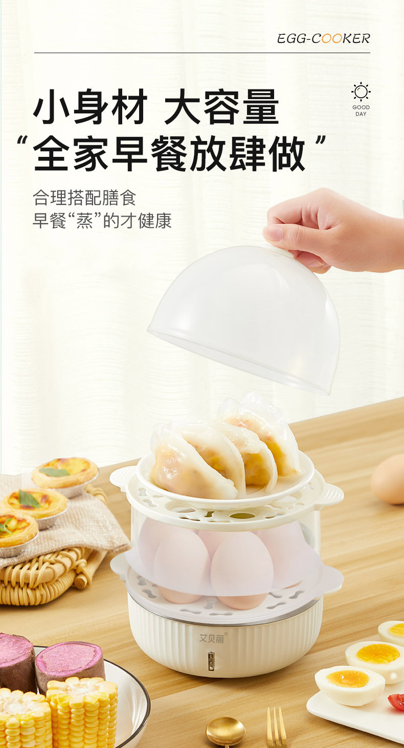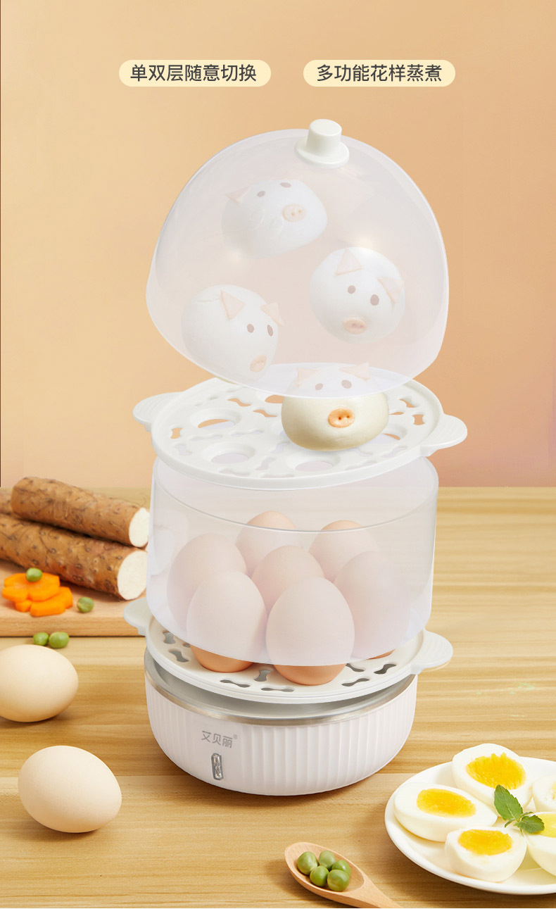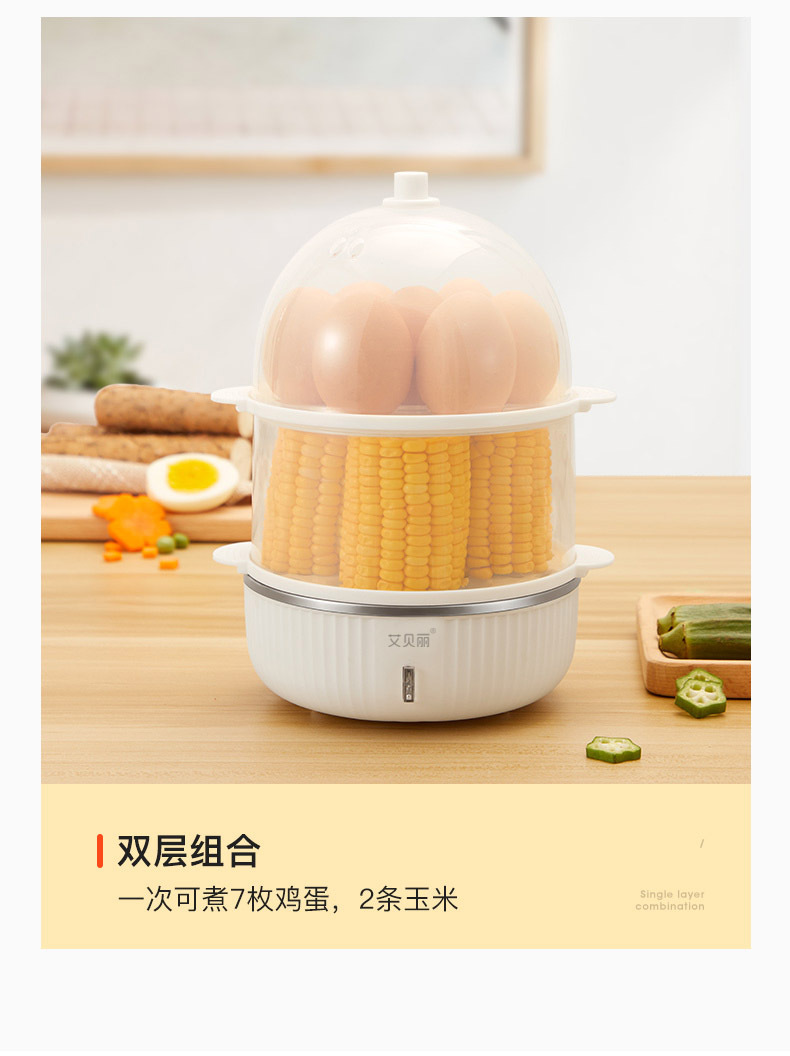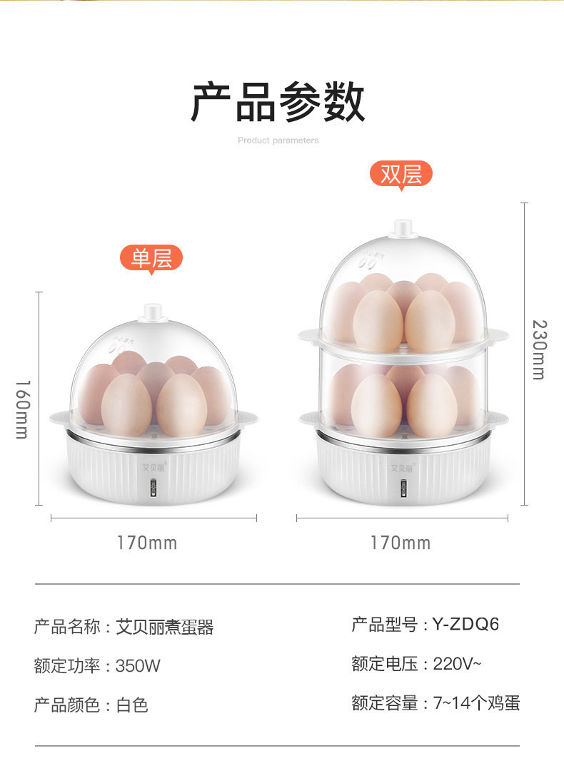 双层蒸蛋器 艾贝丽 Y-ZDQ6 1. 底盘无水自动断电,防干烧功能 2. 食品级PP材料,不锈钢发热底盘,安全健康 3.一键启动,方便快捷