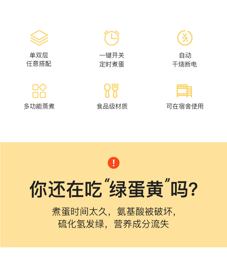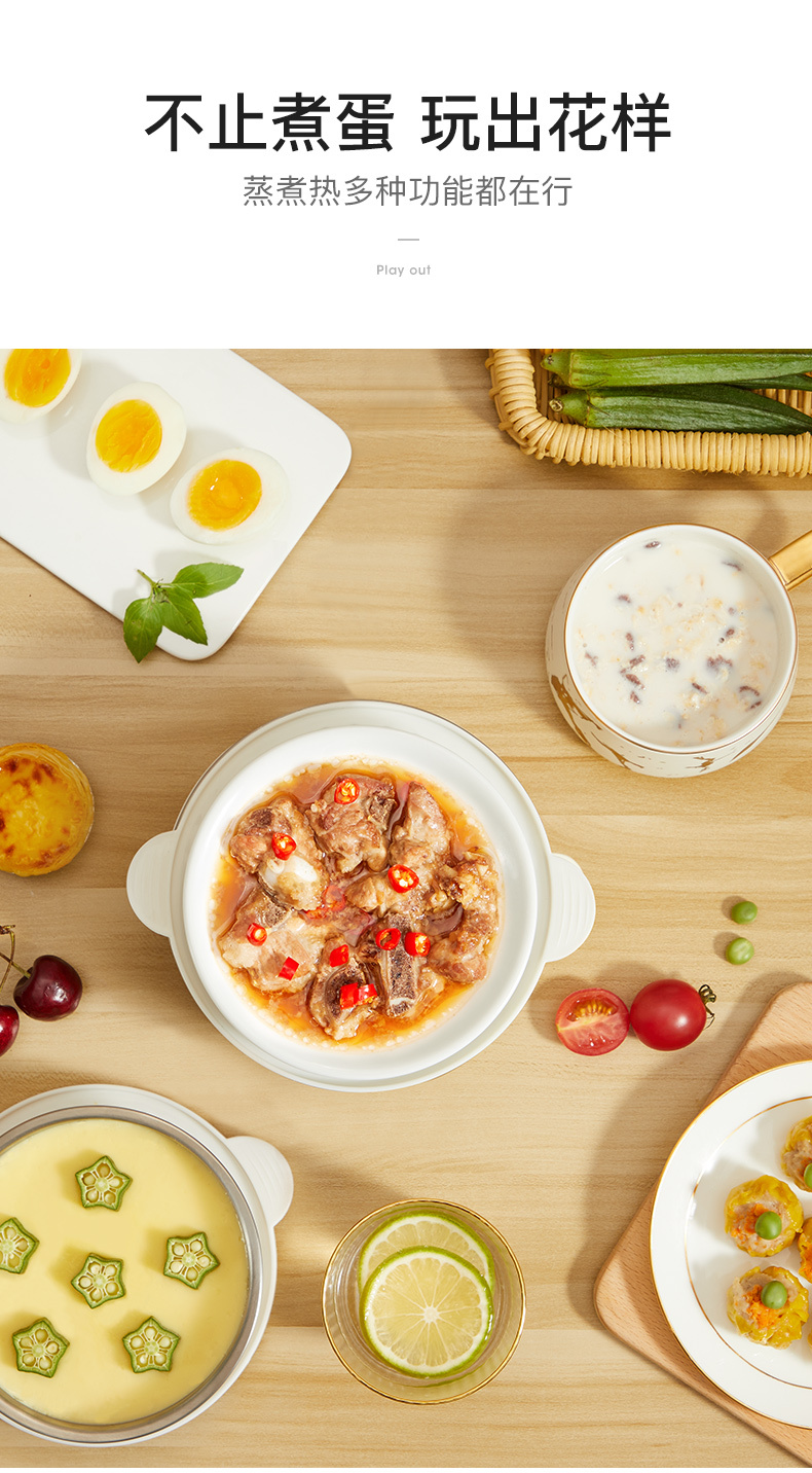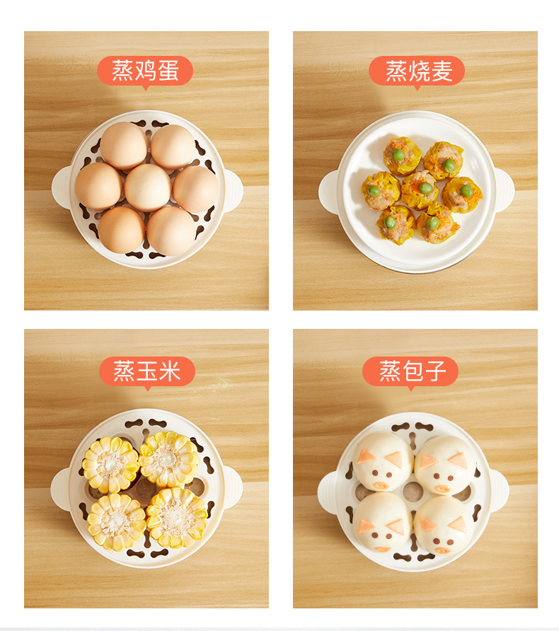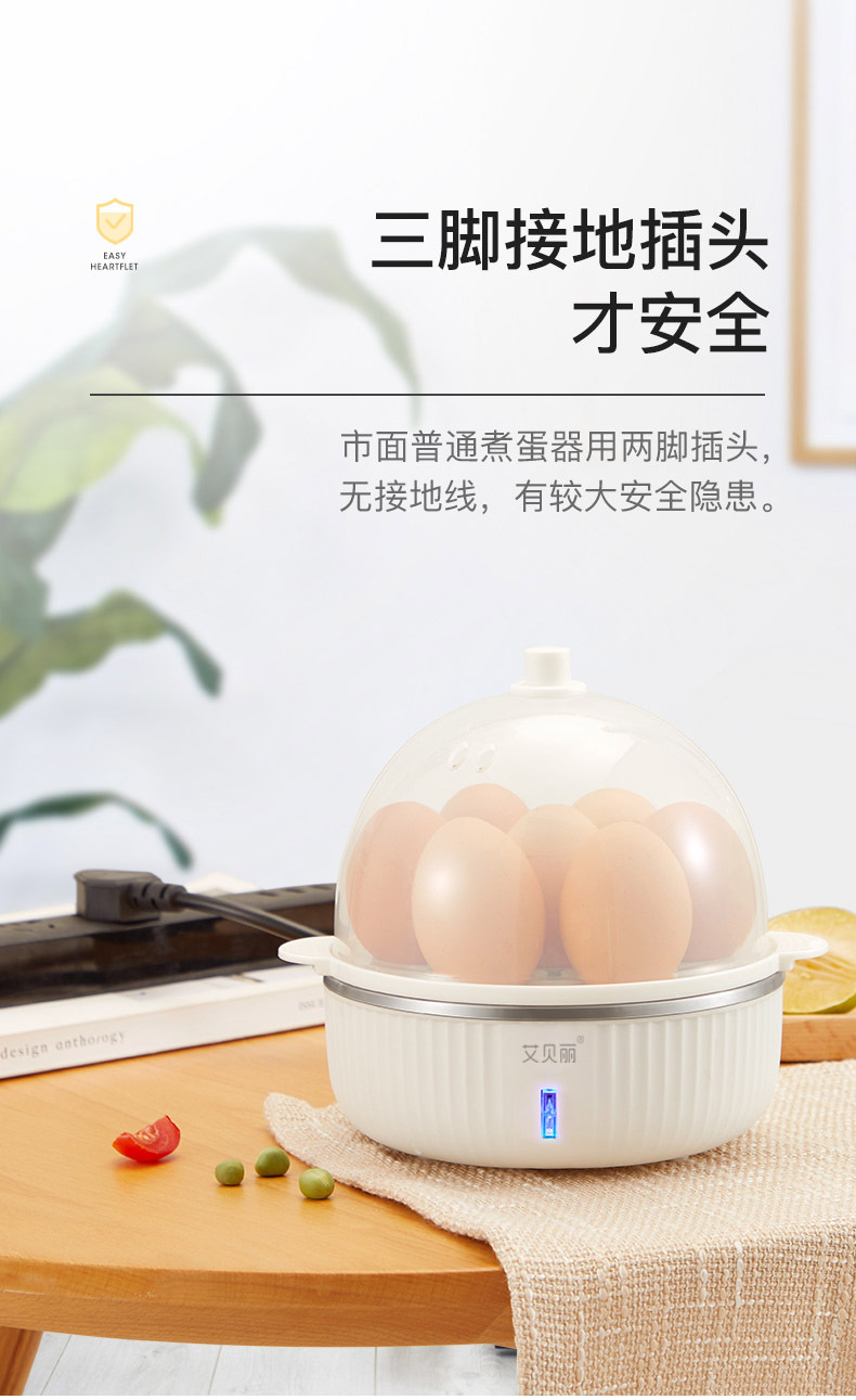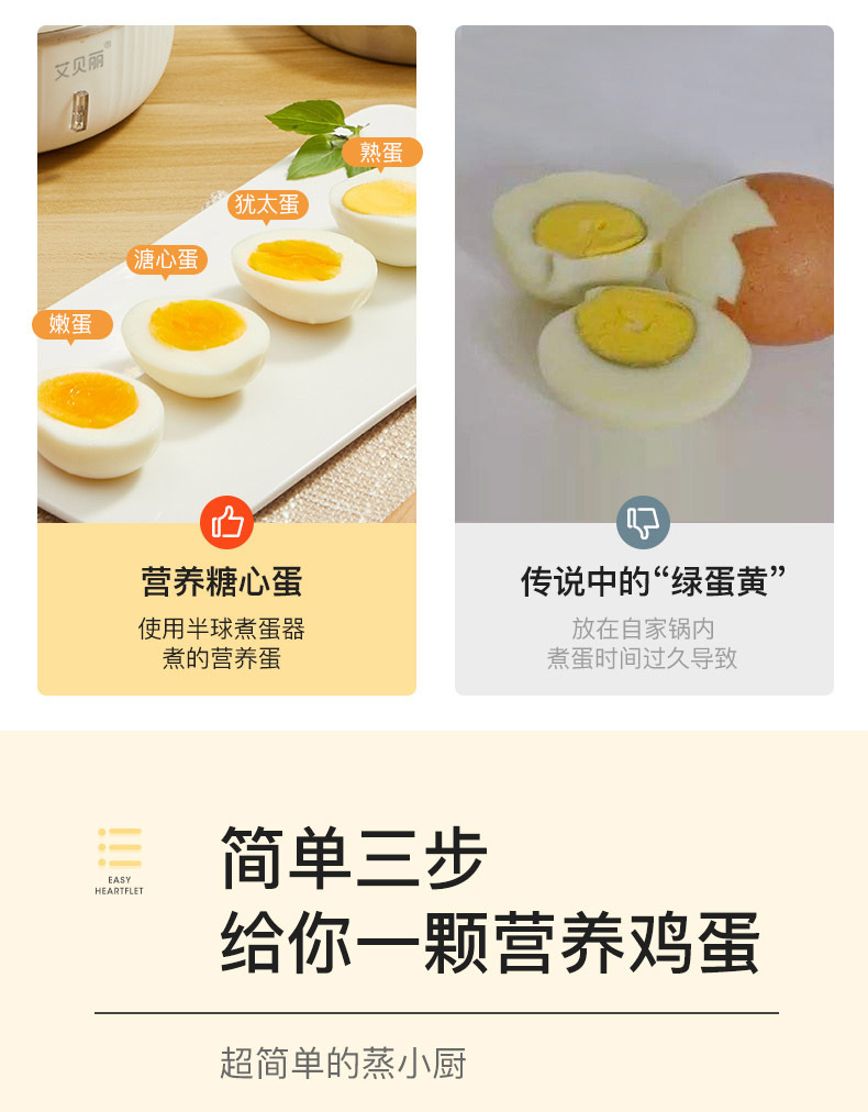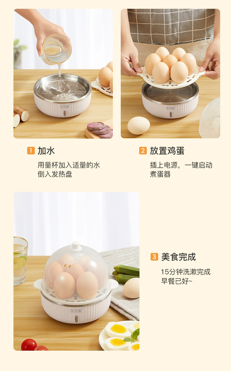 双层蒸蛋器 艾贝丽 Y-ZDQ6 1. 底盘无水自动断电,防干烧功能 2. 食品级PP材料,不锈钢发热底盘,安全健康 3.一键启动,方便快捷