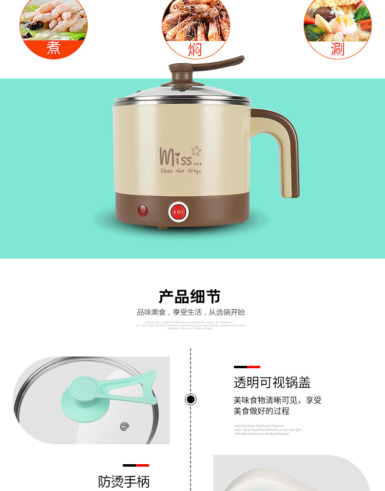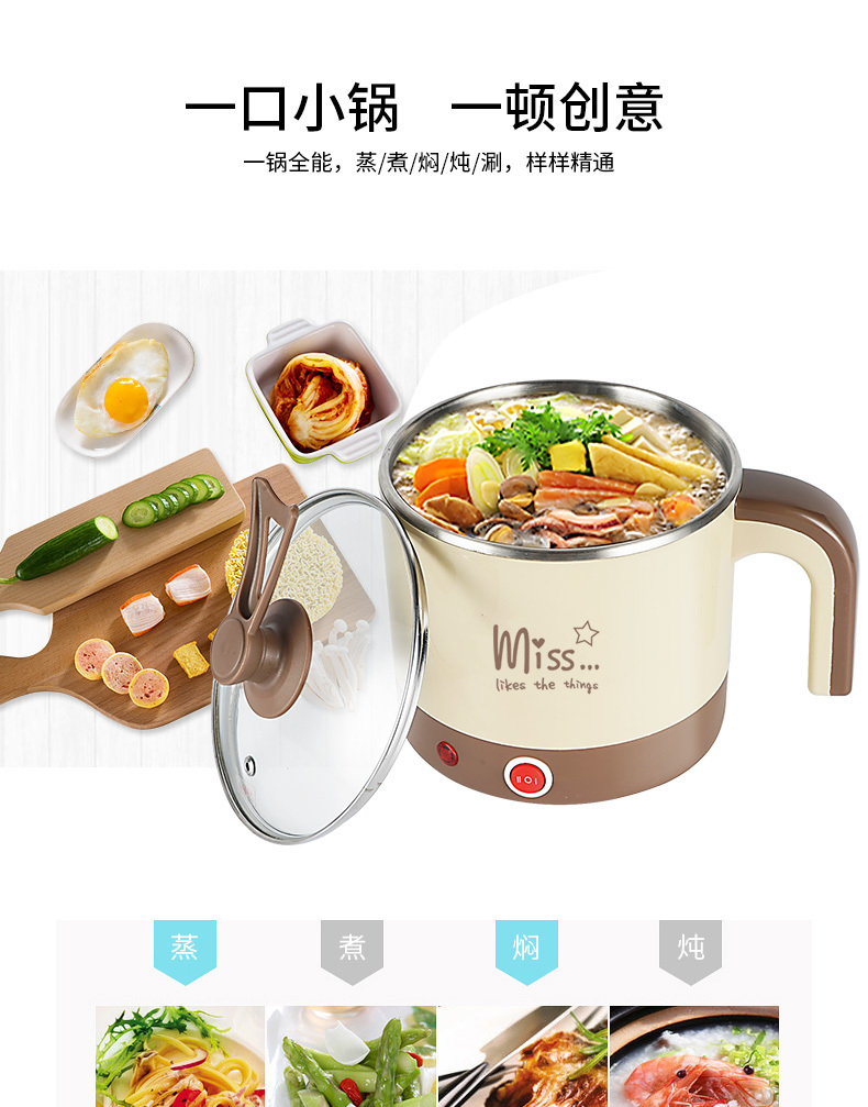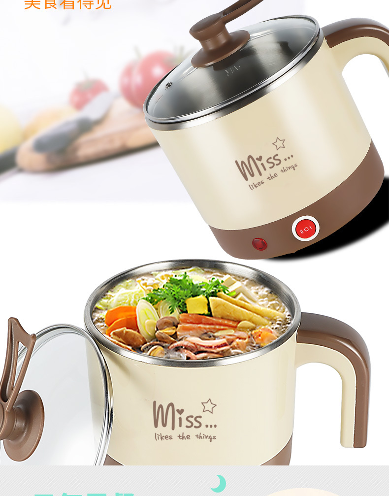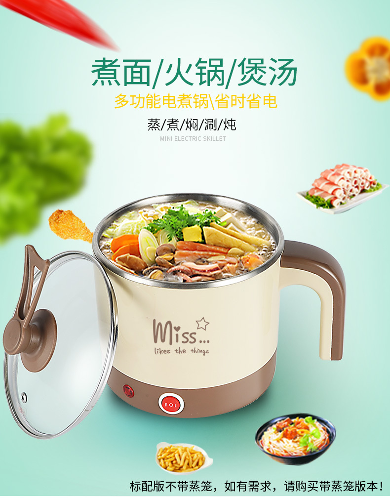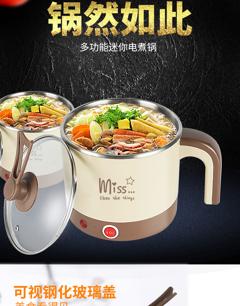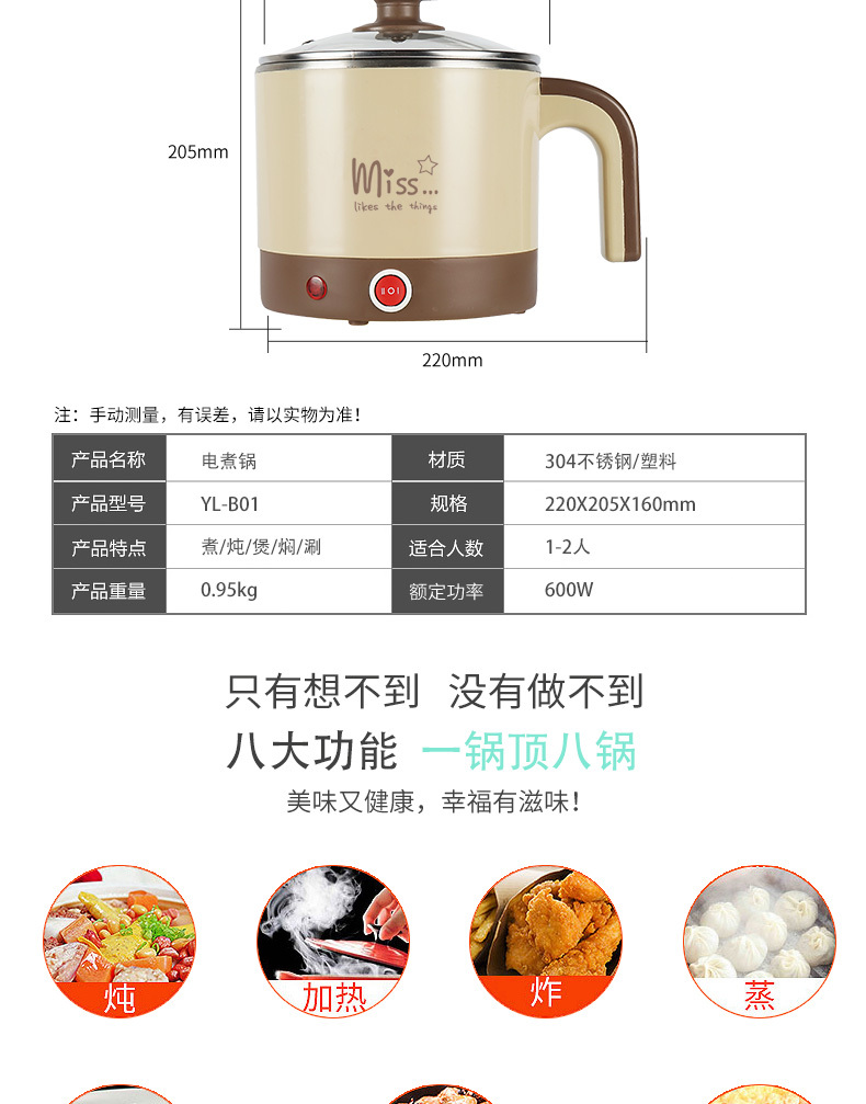 电煮锅 艾贝丽 YL-B01 产品颜色:咖啡色 产品容量:1.5L 额定功率:600W 额定电压:220V~ 产品毛重:1.1KG 产品尺寸:230*180*200MM 包装尺寸:185*180*220MM 装箱数量:单台为网购盒包装箱