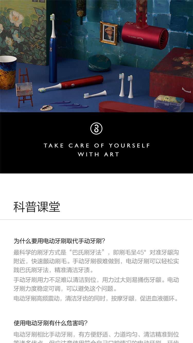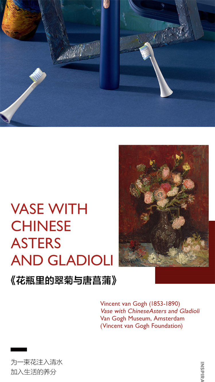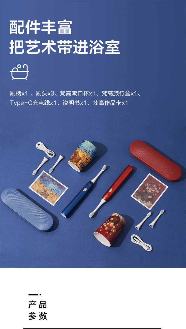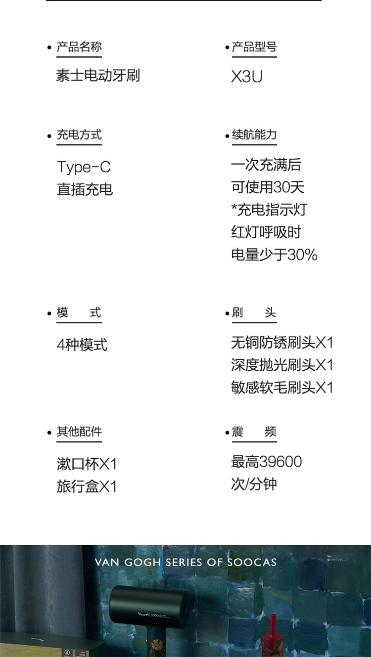 【4周高效美白牙齿】梵高定制联名款声波电动牙刷3种刷头,4种模式,无铜植毛工艺,39600次/分钟震动,手感好(X3U)