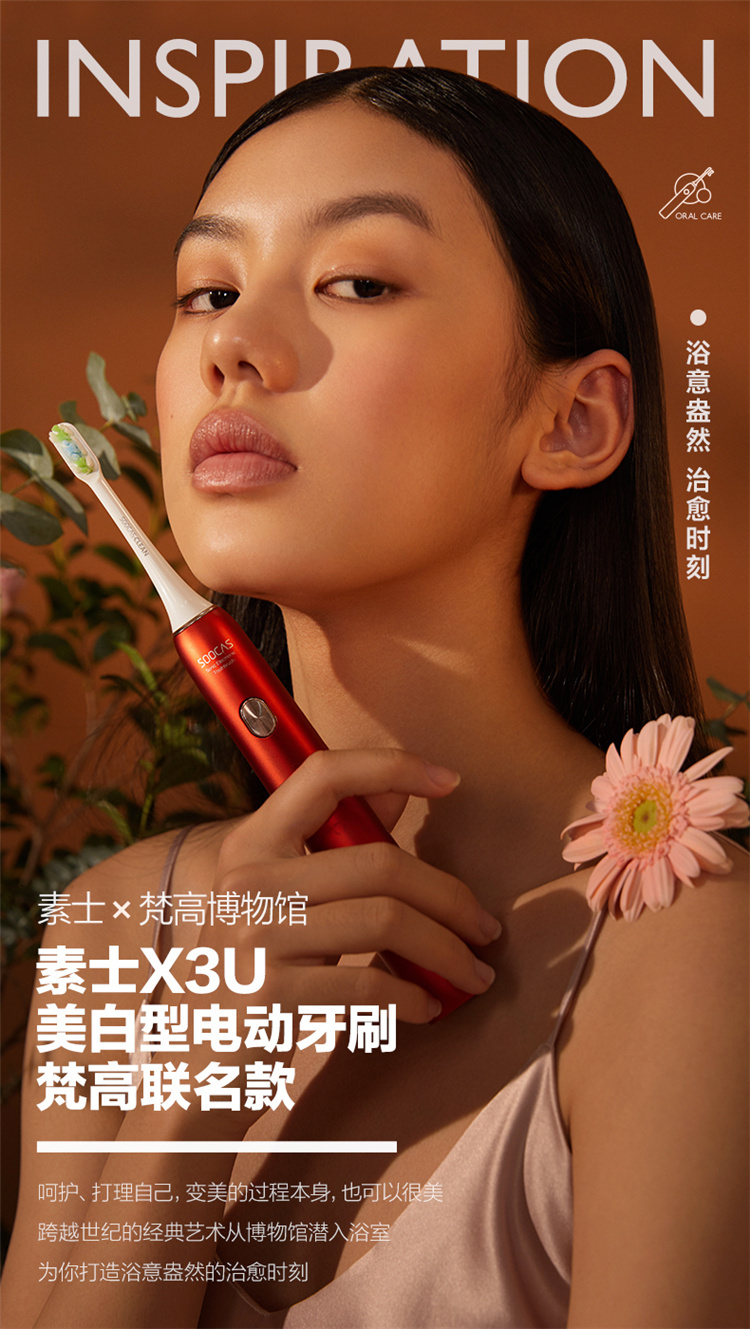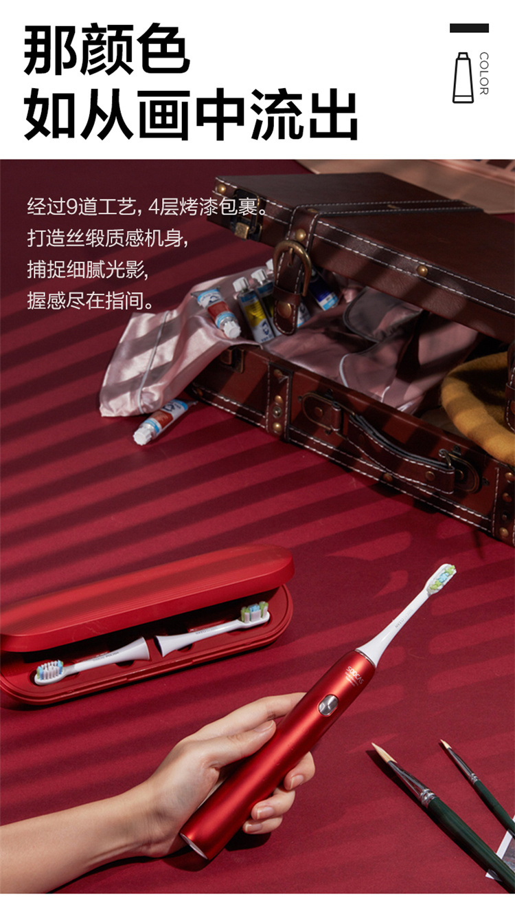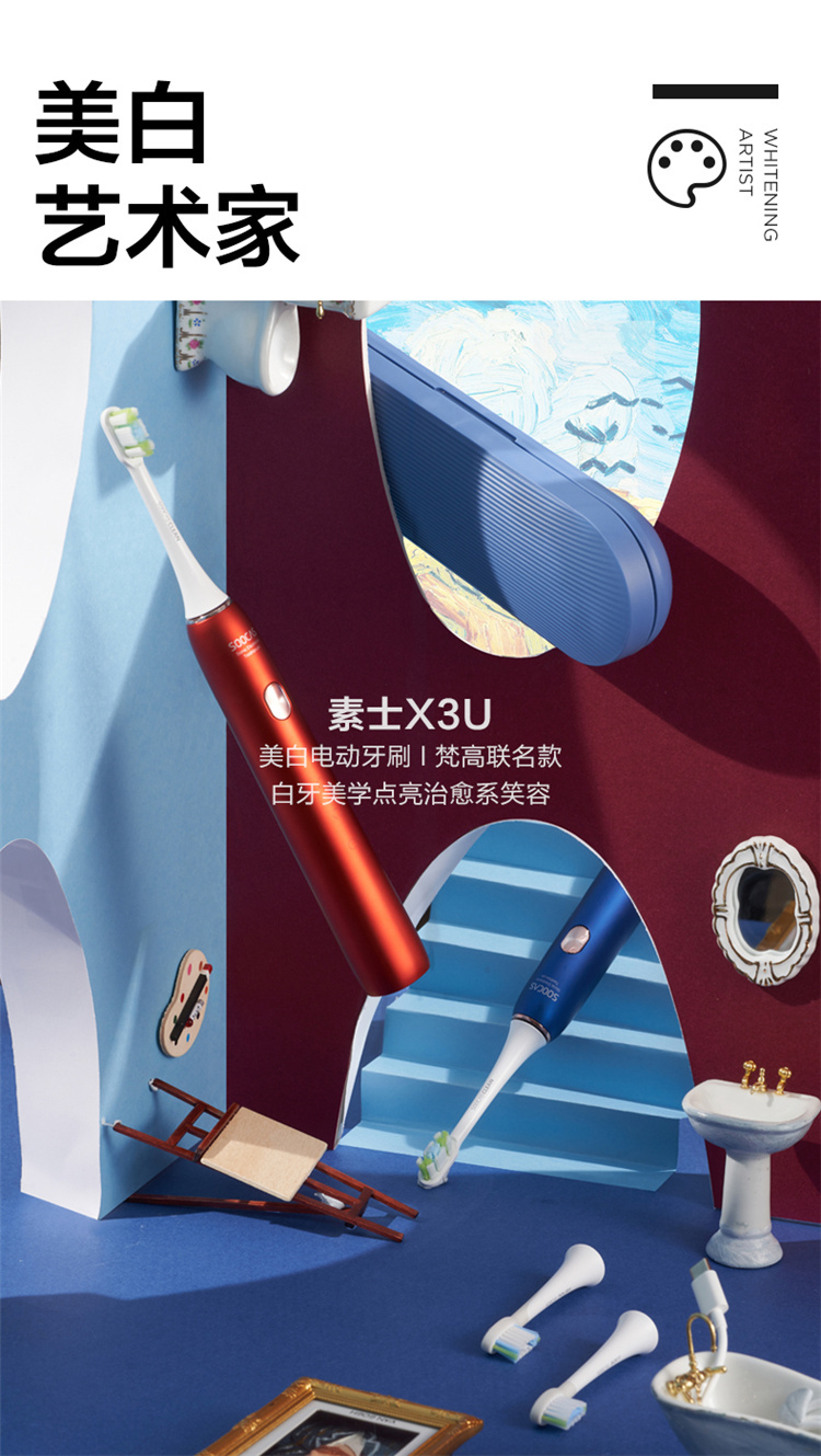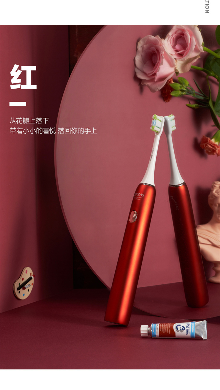 【4周高效美白牙齿】梵高定制联名款声波电动牙刷3种刷头,4种模式,无铜植毛工艺,39600次/分钟震动,手感好(X3U) 梵高红