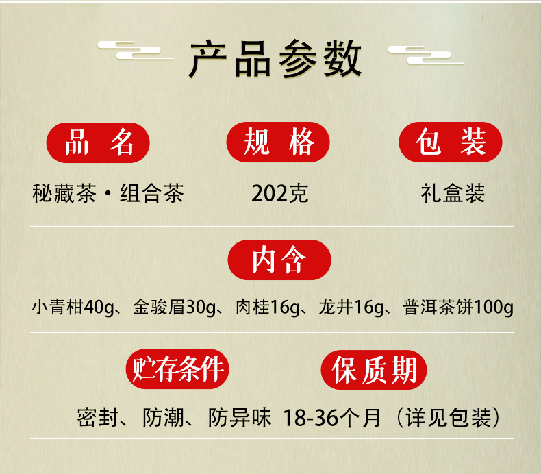 【大礼盒秘藏茶】内含小青柑、金骏眉、肉桂、龙井、普洱茶饼共5种茗茶,一饮一罐,定量分装(202g)