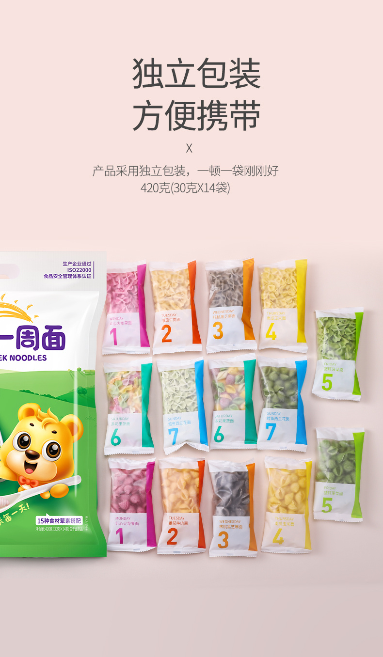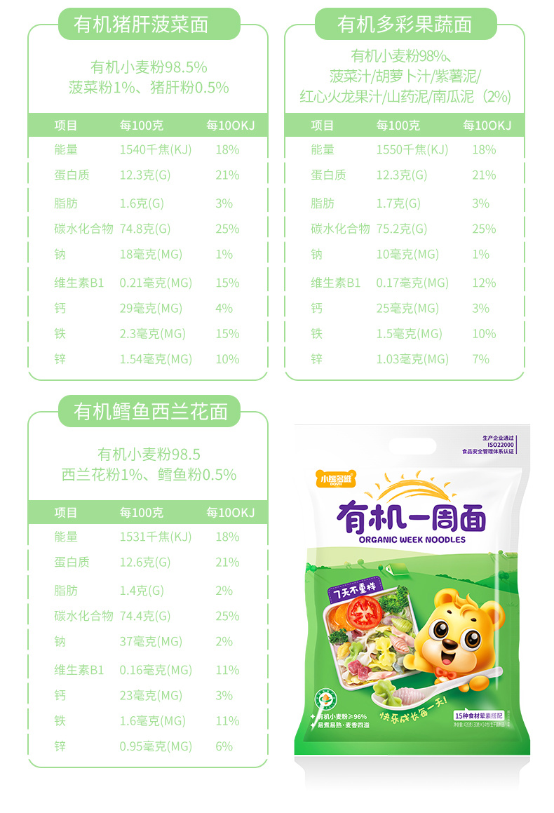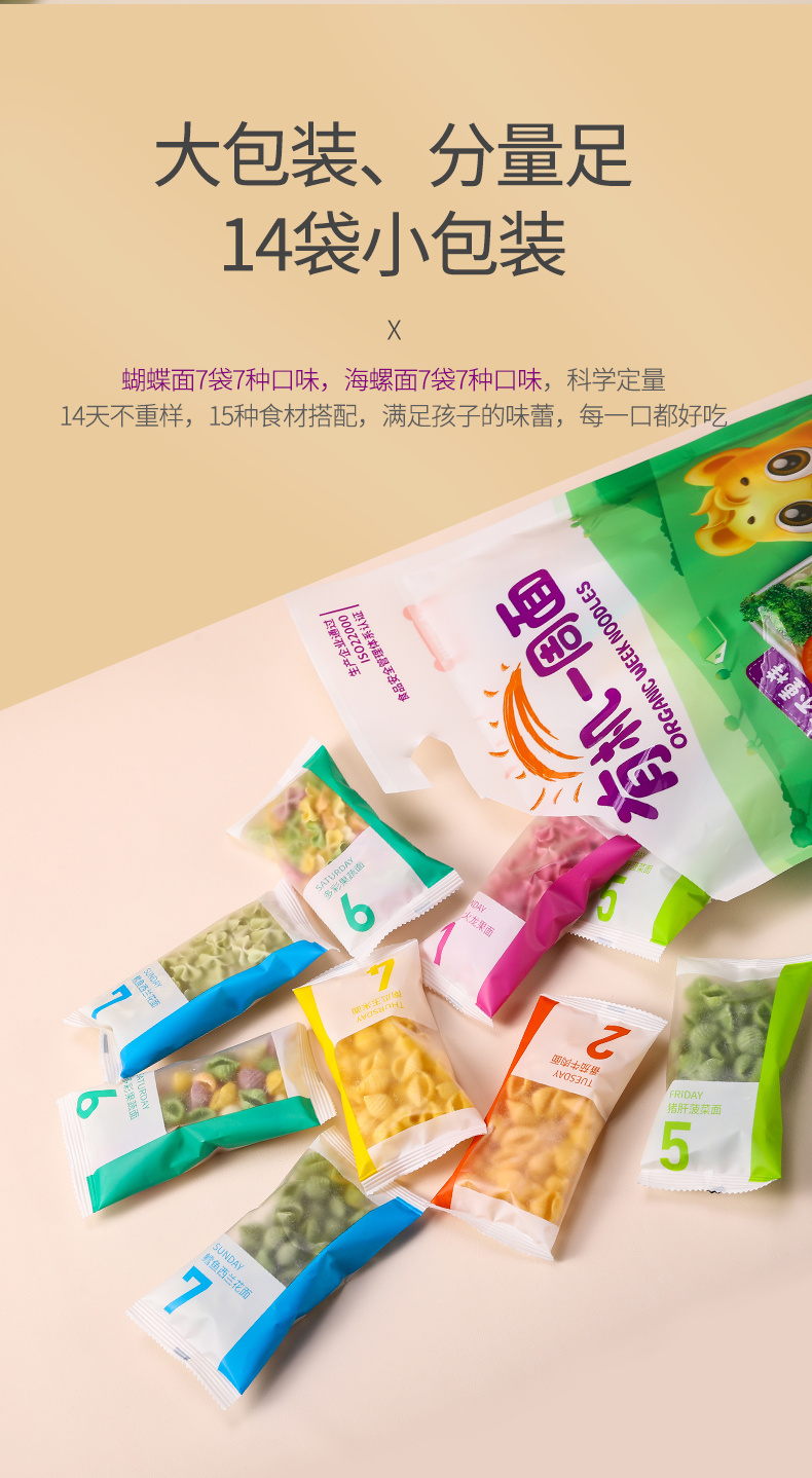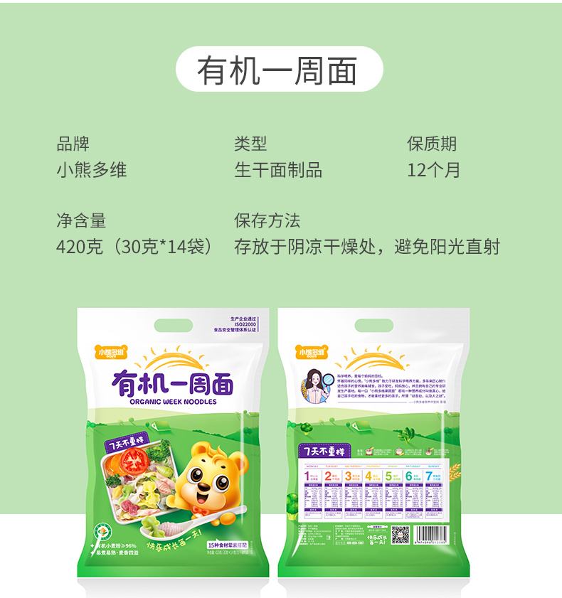 【2袋装,宝宝一吃就爱上】有机一周面/果蔬面,有机小麦粉含量>96%,果蔬浆含量≥30,%低温4-5小时烘干,不添加食用盐不伤宝宝肠胃(420g/袋) 有机一周面 1袋+每日果蔬面 1袋
