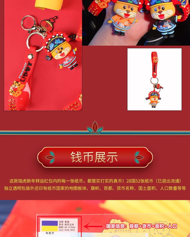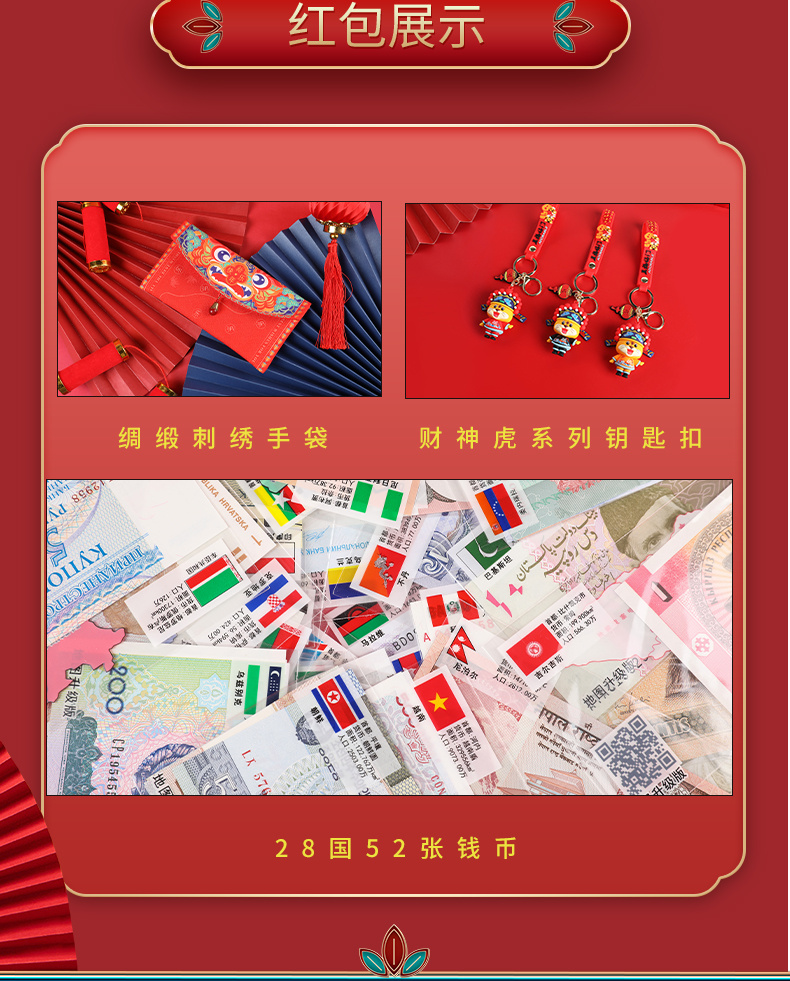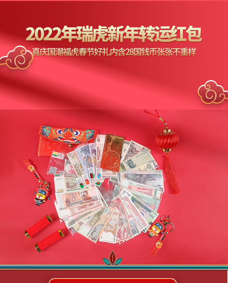【最值得珍藏的红包】2022瑞虎转运红包,28国52张纸币,均支持银行等发行机构检验,绸缎刺绣手袋,虎纹提花斜纹缎,寓意美好